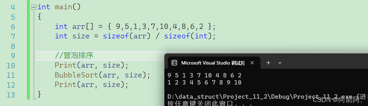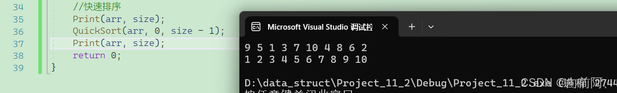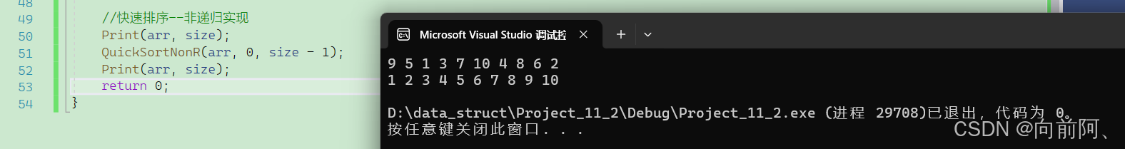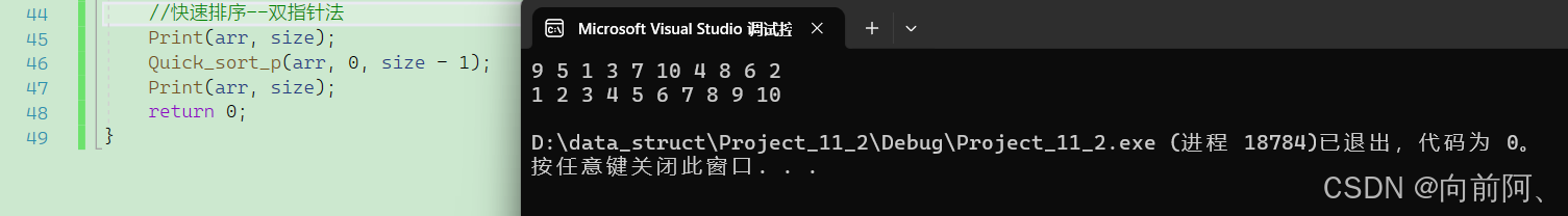 {if (left >= right){return;}int prev = left;int cur = prev + 1;int keyi = left;while (cur <= right){if (arr[cur] < arr[keyi]){prev++;Swap(&arr[prev], &arr[cur]);}cur++;}//此时prev是中间值坐标Swap(&arr[keyi], &arr[prev]);keyi = prev;Quick_sort_p(arr, left, keyi - 1);Quick_sort_p(arr, keyi + 1, right);