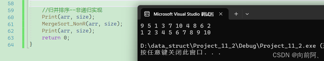 {//首先创建一个数组,用于套换int* tmp = (int*)malloc(sizeof(int) * size);if (tmp == NULL){perror("malloc fail!");return NULL;}_MergeSort(arr, tmp, 0, size - 1);free(tmp);tmp = NULL;
