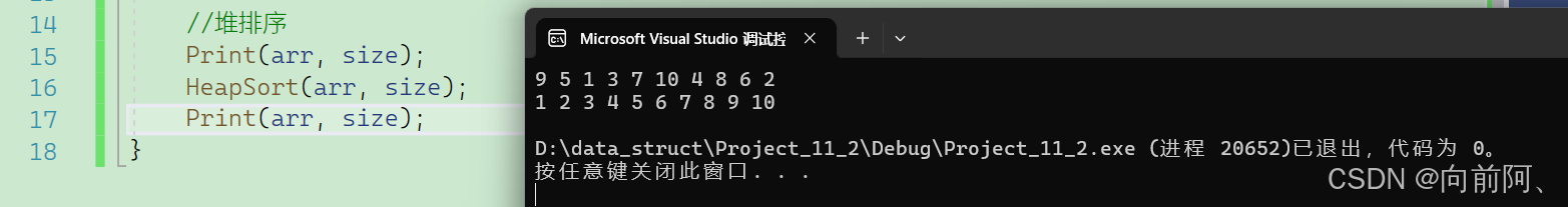 {//首先向下调整建堆for (int i = (size - 1 - 1) / 2 ; i >= 0 ; i--){big_AdjustDown(arr, size, i);}//此时开始交换int end = size - 1;while (end>0){Swap(&arr[0], &arr[end]);big_AdjustDown(arr, end, 0);end--;}