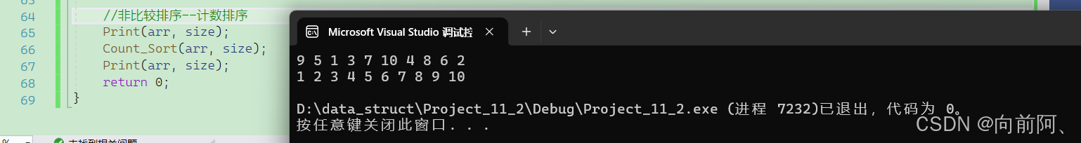 {int min = arr[0];int max = arr[0];//寻找最大值和最小值for (int i = 0; i < size; i++){if (arr[i] < min){min = arr[i];}if (arr[i] > max){max = arr[i];}}//防止空间浪费,所以找最大值和最小值,求值所在的区间int range = max - min + 1;int* count = (int*)calloc(range, sizeof(int));if (count == NULL){perror("calloc fail!");return;}//统计次数for (int i = 0; i < size; i++){count[arr[i] - min]++;}//往原数组里面插入数据,记得加上minint cur = 0;for (int i = 0; i < range; i++){while (count[i]--){arr[cur++] = i + min;}}