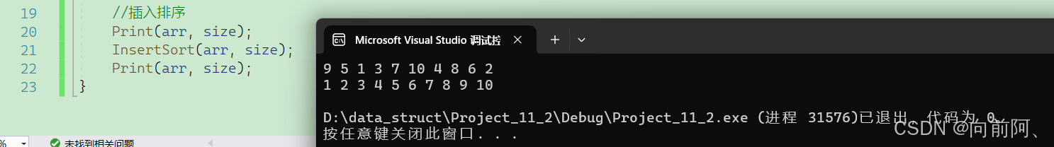 {if (left >= right){return;}int begin = left;int end = right;int keyi = left;while (begin < end){//右边找小while (begin < end && arr[end] >= arr[keyi]){end--;}//左边找大while (begin < end && arr[begin] <= arr[keyi]){begin++;}//此时说明找到了Swap(&arr[end], &arr[begin]);}//此时说明begin==endSwap(&arr[keyi], &arr[begin]);keyi = begin;//此时区间被分割成[left,keyi-1],keyi,[keyi+1,right] QuickSort(arr, left, keyi - 1);QuickSort(arr, keyi + 1, right);
