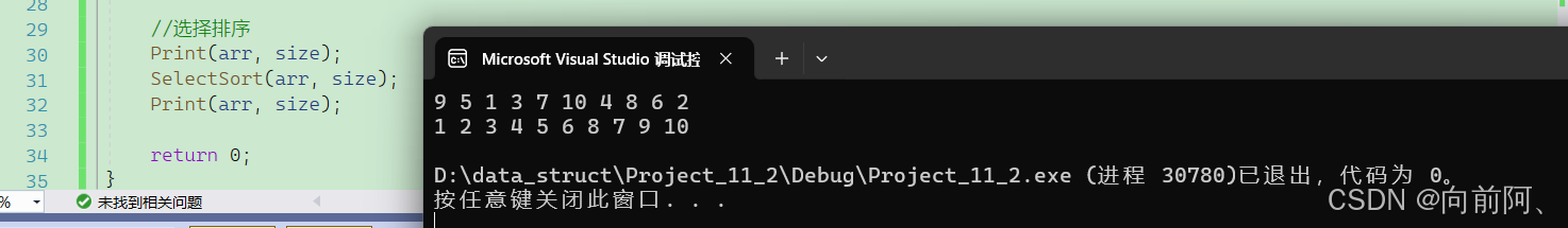 {int begin = 0;int end = size - 1;int maxi = begin;int mini = begin;while (begin < end){for (int i = begin + 1; i <= end; i++){if (arr[maxi] < arr[i]){maxi = i;}if (arr[mini] > arr[i]){mini = i;}}//一轮找一个最大值和一个最小值Swap(&arr[begin], &arr[mini]);if (maxi == begin){maxi = mini;}Swap(&arr[maxi], &arr[end]);begin++;end--;}
