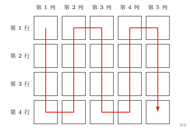 例如,若 n=4,m=5n = 4, m = 5n=4,m=5,则所有 4×5=204 \times 5 = 204×5=20 名考生将按照 CSP-J 2025 第一轮成绩从高到低的顺序,根据下图中的箭头顺序分配座位。