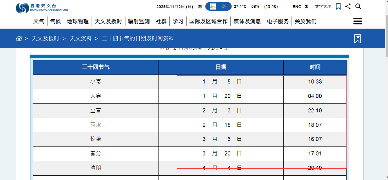2025年 24 节气[小寒]进入时刻(北京时间,精确到秒)==>2025年1月5日 10:32:47;进入时辰==>巳时;所属季节==>冬季