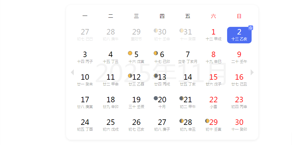 Tyme组件不仅支持按照节气索引来查询节气名称,还支持直接按照节气名来进行查询,比如查询2025年的霜降的具体时间。调用fromName(year, name)得到其对象。year为公历年,当传入2026年时,取到的冬至,实际上是在2025年,这里一定要注意;name为字符串,当名称不存在时,会抛出参数异常。