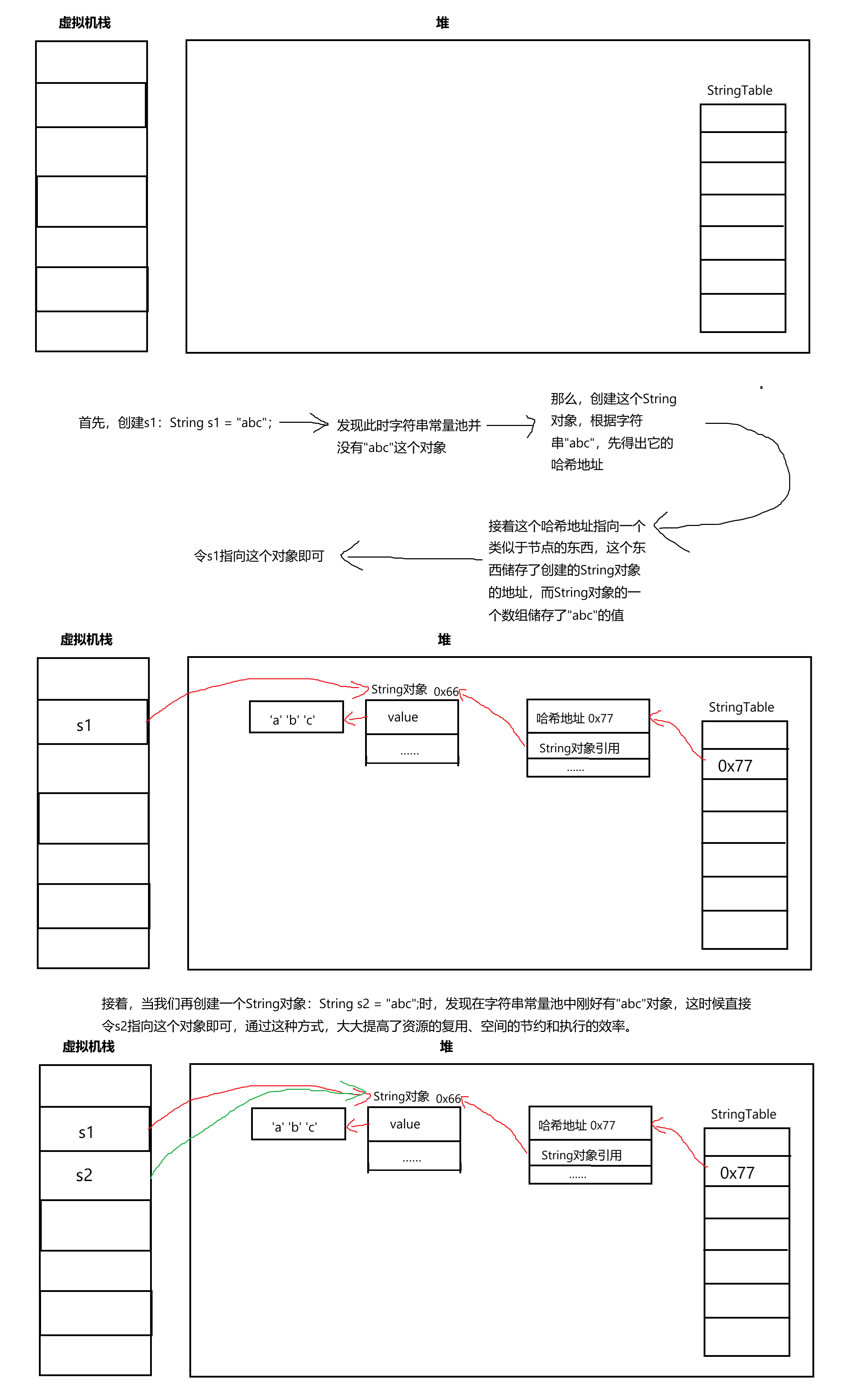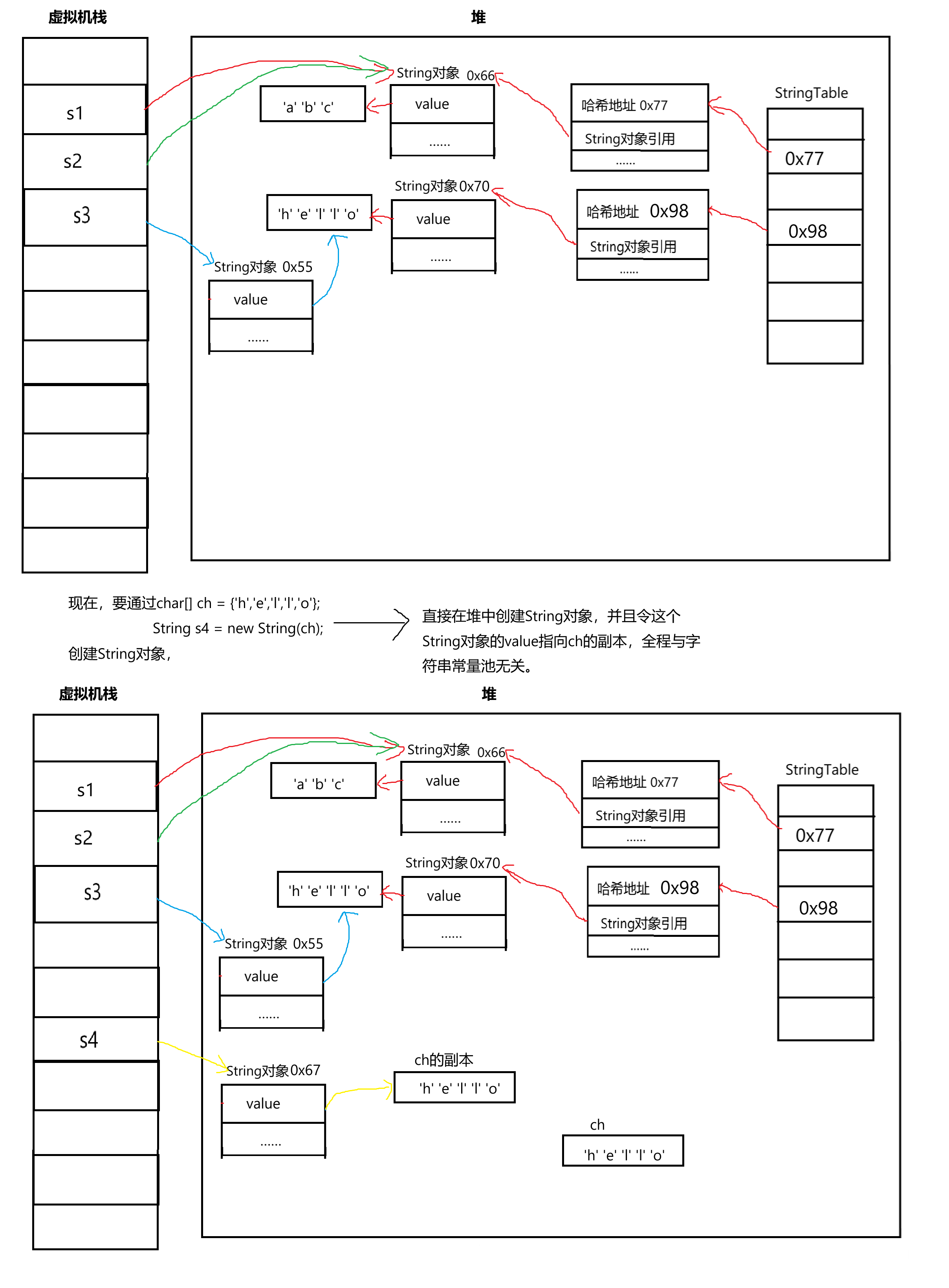 当我们通过像:String s3 = new String("hello");这样的方式创建String对象时,创建的过程是这样的:JVM会先去字符串常量池查找是否存在“hello”这个String对象,如果没有就在字符串常量池中创建String对象("hello"),接着获取储存"hello"数组的引用;如果有,就直接获取"hello"数组的引用。接着按照构造方法String(String original)在堆中创建一个String对象,并且令这个String对象的value指向获取的"hello"的数组,这就实现了String对象的创建。