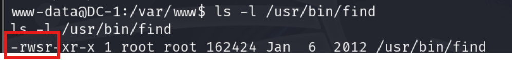 检查find是否有suid位,输出有s!表示find有suid位,表示,只要执行find命令,就会以root权限运行!
