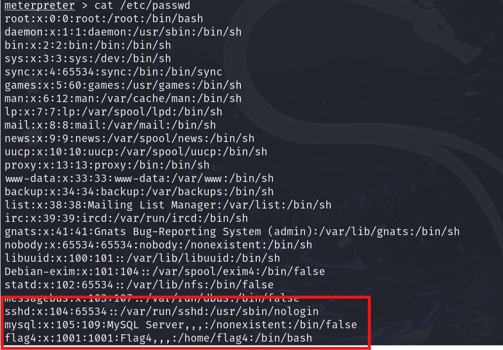 先看一下/etc/passwd文件,发现了flag4用户!!并且有bin/bash——/bin/bash代表这个用户可以通过找到密码手动登录