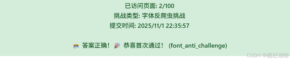 for page in range(1,101):url=f'https://www.spiderdemo.cn/font_anti/api/font_anti_challenge/page/{page}'res=requests.get(url=url,params=params,cookies=cookie,headers=headers)data=res.json()b64_font=data['b64Font']page_data=data['page_data']with open(f'./font/font_{page}.woff2','wb') as f:f.write(base64.b64decode(b64_font))mapping=get_map(page)print(mapping)for item in page_data:number_str = ''for ch in item:number_str += str(mapping[ch])print(number_str)total += int(number_str)print("第{}页获取完成".format(page))