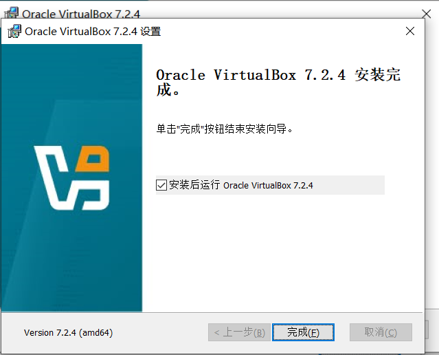 安装完成后,点击"完成"启动VirtualBox。