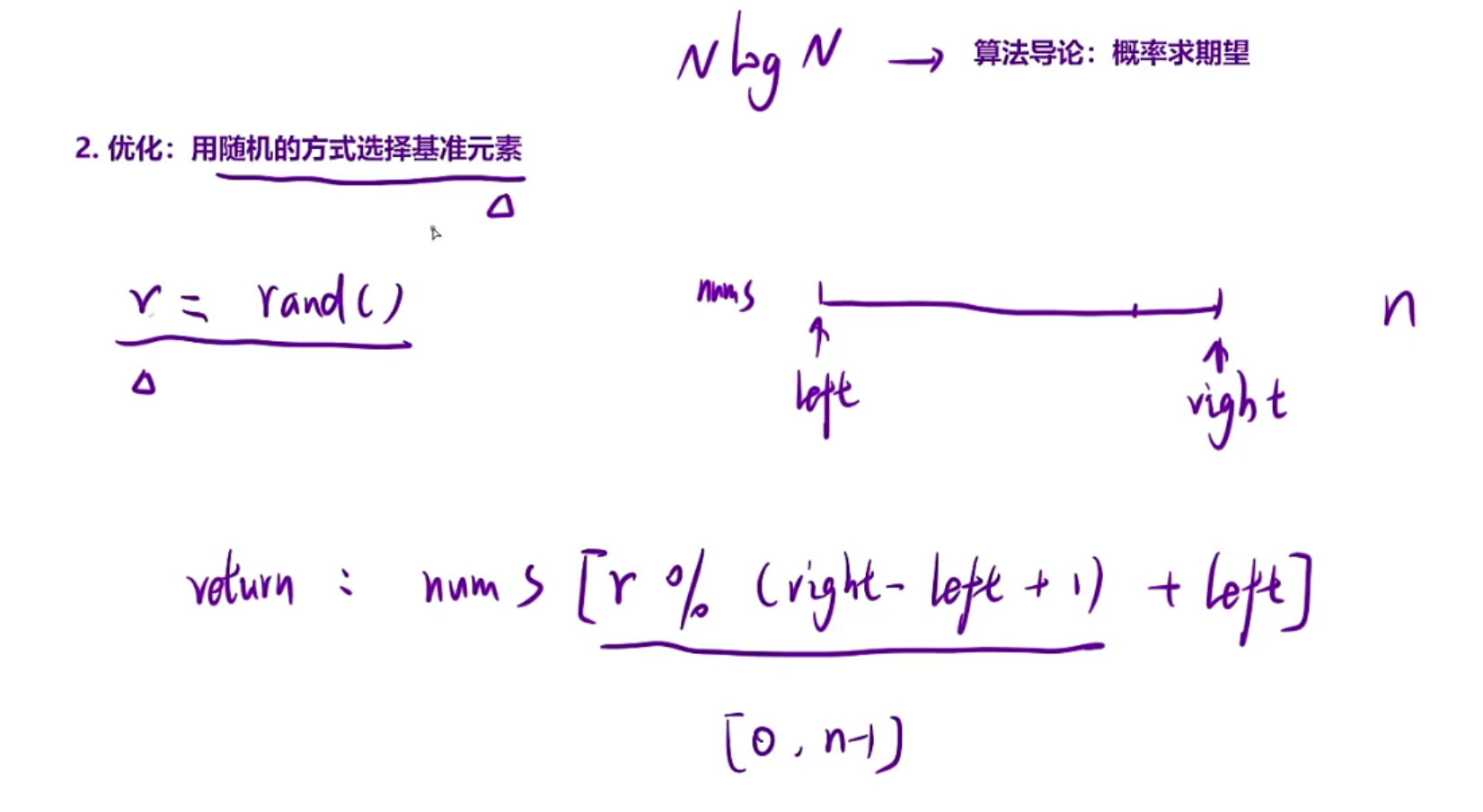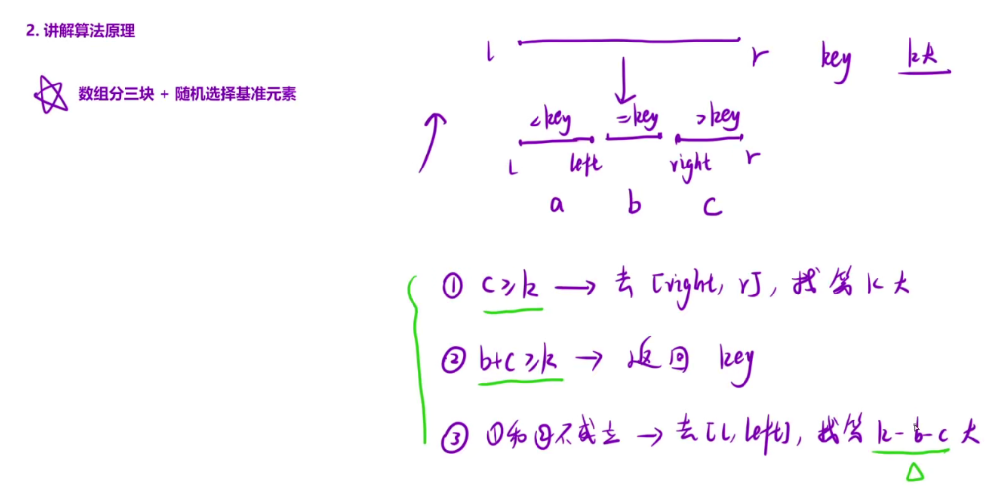 本篇主要是讲解分治的思想,通过快排来理解,快排的时间复杂度是O(nlogn),主要区分是分为三部分还是两部分(两部分时间复杂度可能会退化),在利用剪枝的思想去优化快排,不是递归左右区间,而是选择某一区间进行递归,时间复杂度变为O(N),具体的推导过程需要查看算法导论