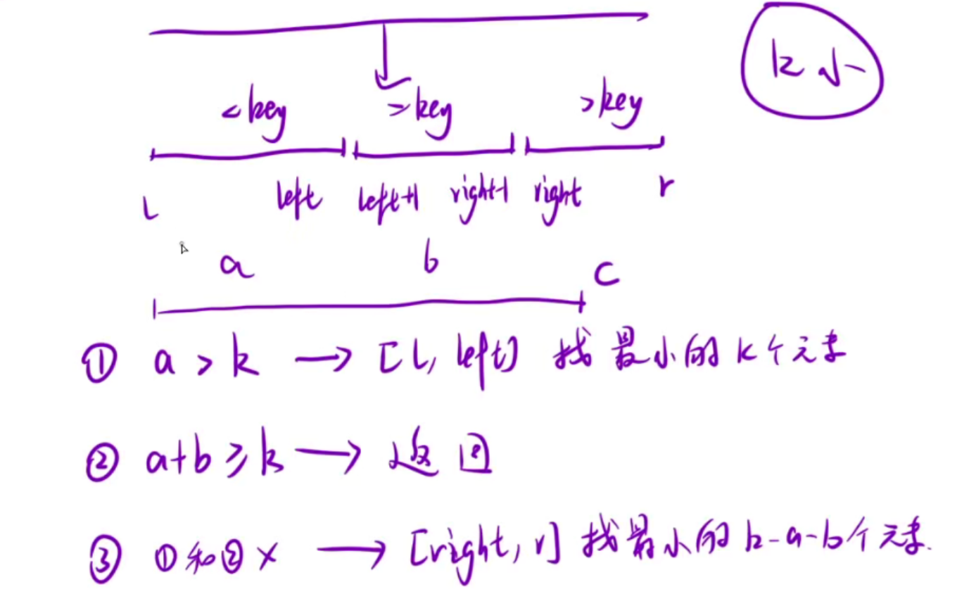 public:// 生成 [l, r] 范围内的随机索引int randnumber(int l, int r) {return rand() % (r - l + 1) + l; // 正确生成 [l, r] 区间的随机索引}void sort(vector<int>& tmp, int l, int r, int k) {if (l >= r)return ;int key = tmp[randnumber(l, r)];int left = l - 1, i = l, right = r + 1;while (i < right) {if (tmp[i] < key) {swap(tmp[++left], tmp[i++]);} else if (tmp[i] == key) {i++;} else {swap(tmp[--right], tmp[i]);}}// 此时已经划分好数组了,升序int a=left-l+1;int b=right-1-left;if (a>= k) {sort(tmp,l,left,k);} else if (a+b >= k) {return ;} else {sort(tmp, right, r, k - a - b);}}vector<int> smallestK(vector<int>& arr, int k) {srand(time(NULL));int n=arr.size();sort(arr,0,n-1,k);return {arr.begin(),arr.begin()+k};}