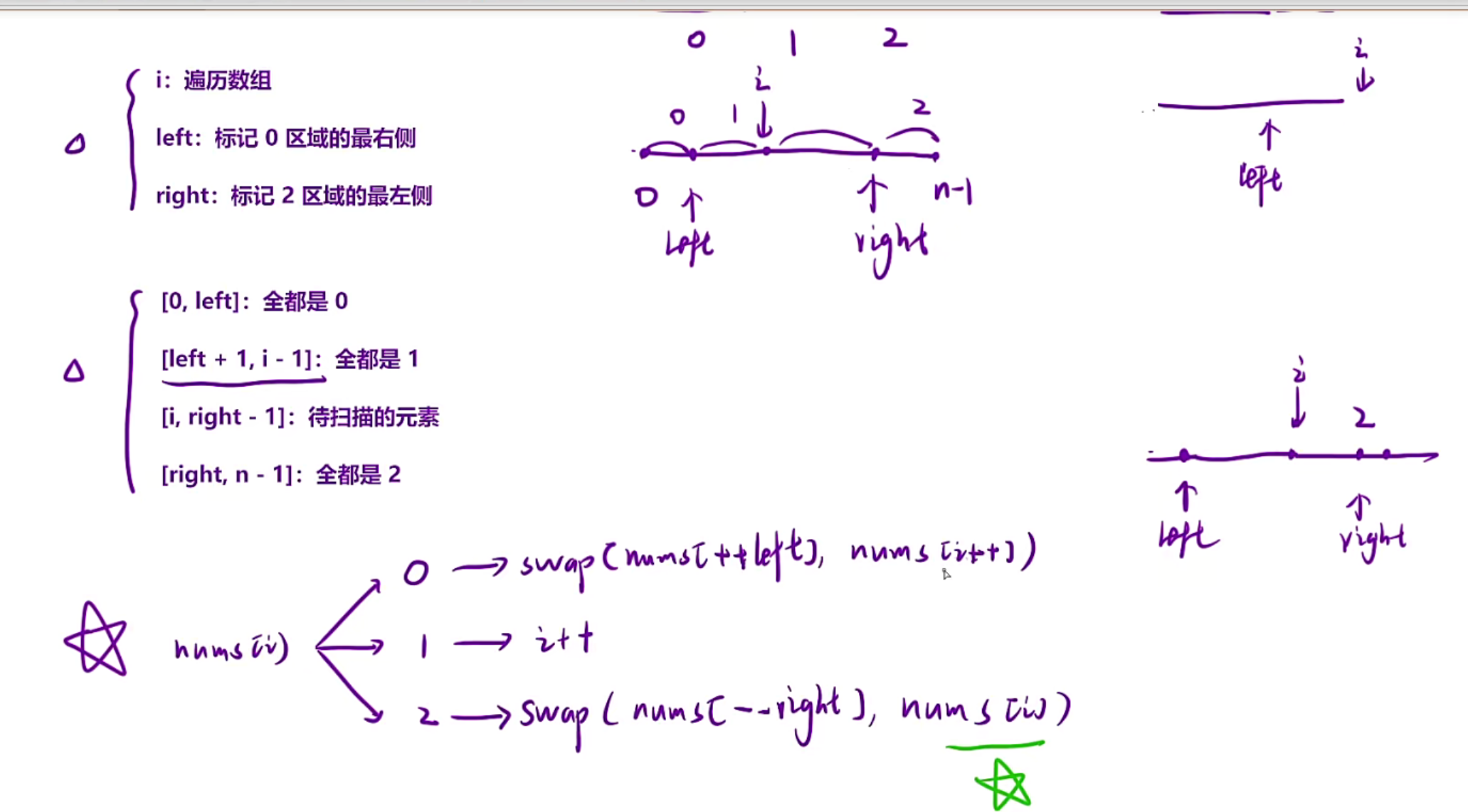right标记右区间【right,n-1】全是2,自然中间【left+1,right-1】都是1,i指针就是遍历数组