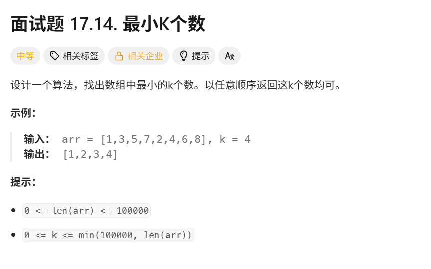 };leetcode面试题17.14.最小的k个数