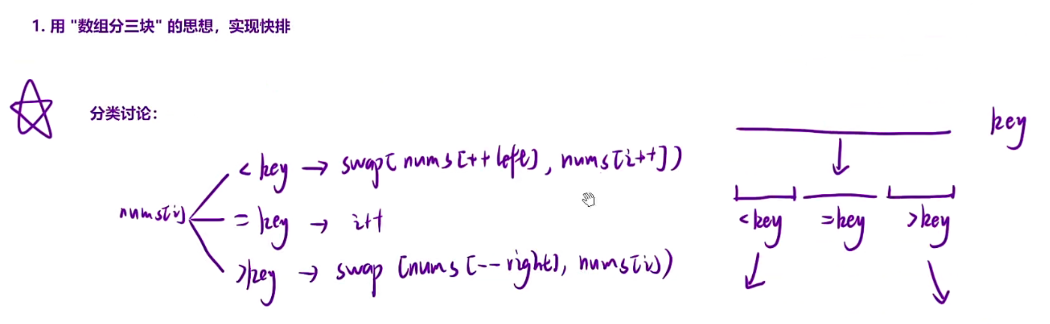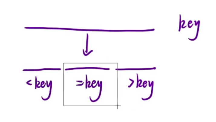 选择一个key,然后划分成三部分区间,然后再依次递归左区间右区间即可