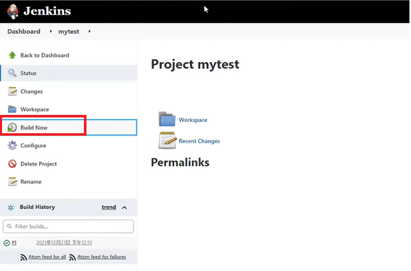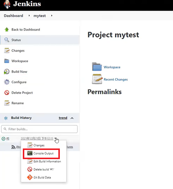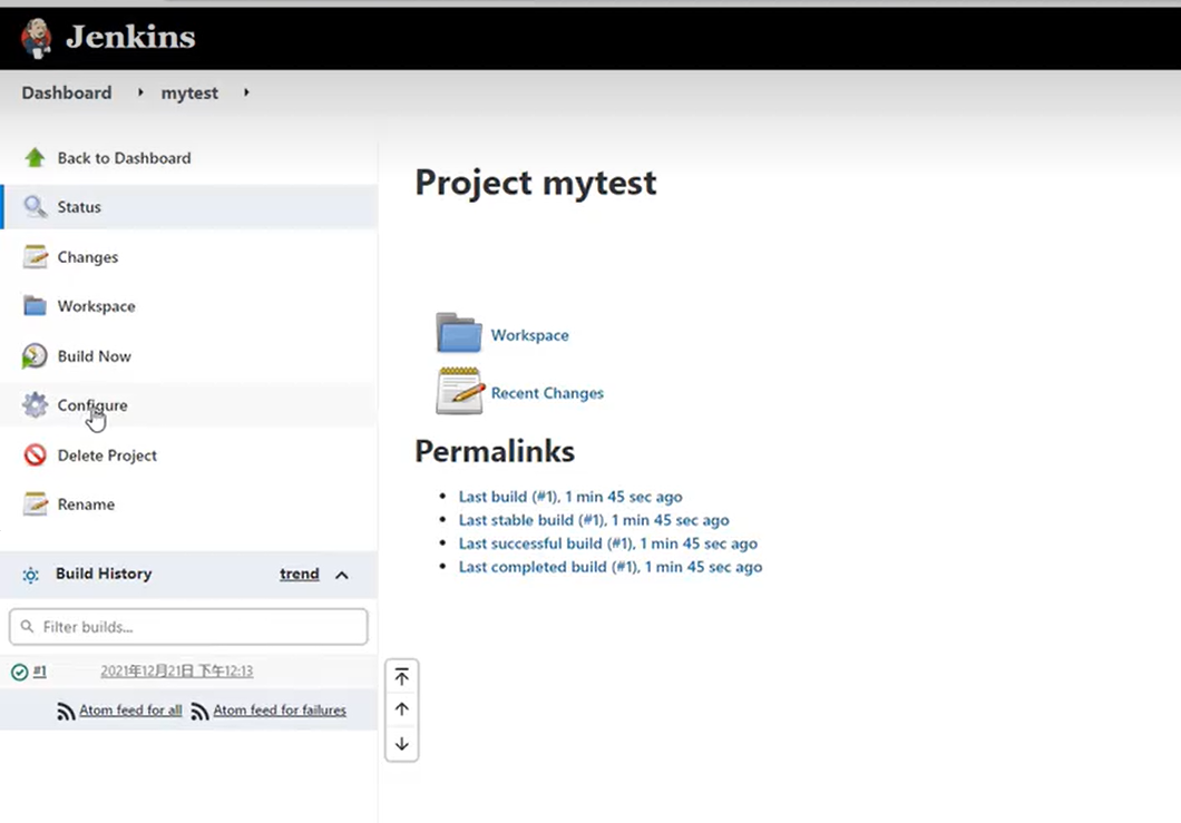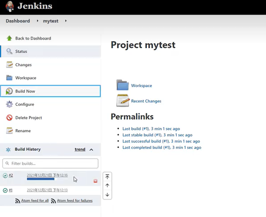 切换到 workspace中,可以看到 mytest 项目,证明已经把mytest拉取到 Jenkins本地。