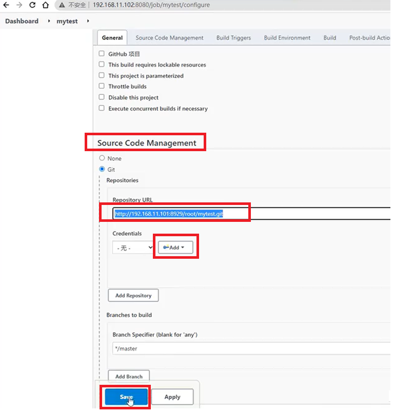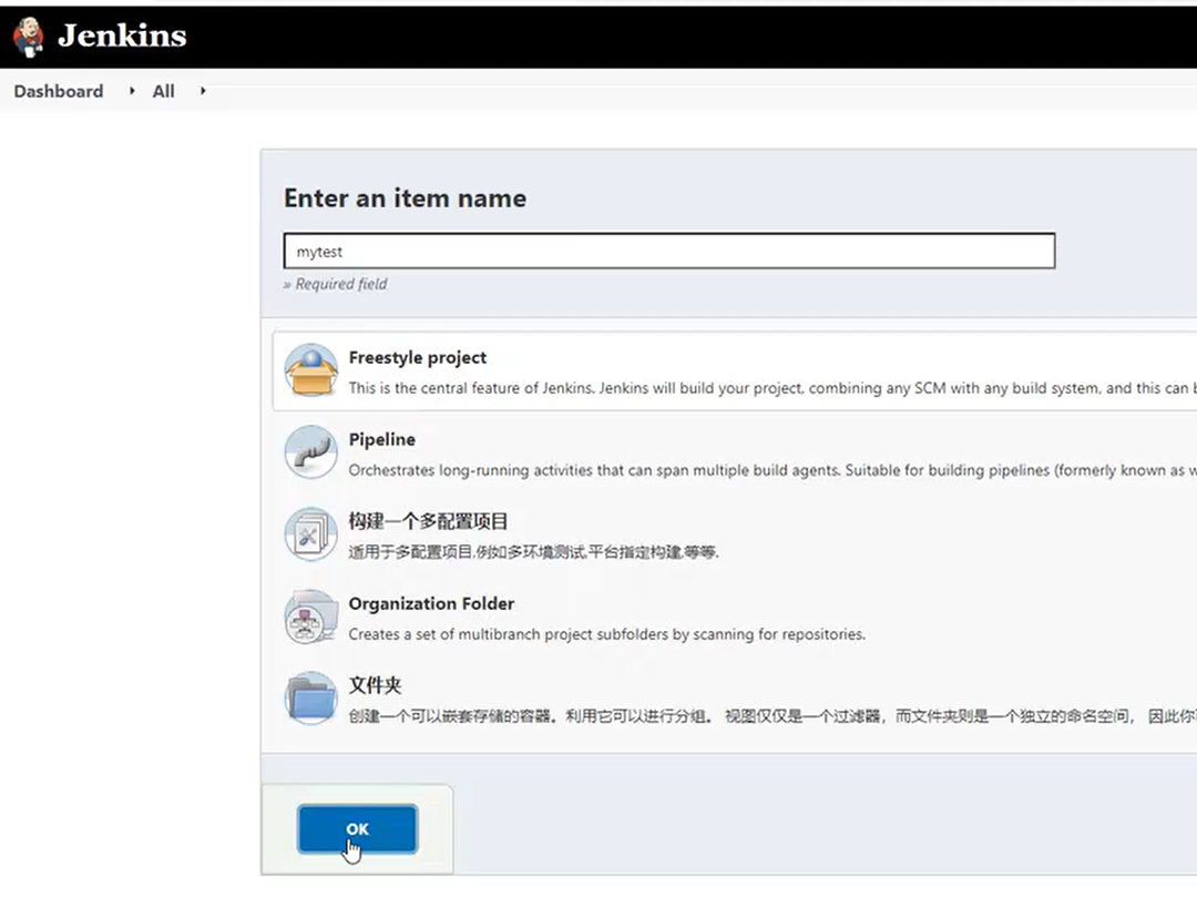 打开 Jenkins 创建一个任务,主要是把 gitlab中的mytest项目与 Jenkins 进行绑定