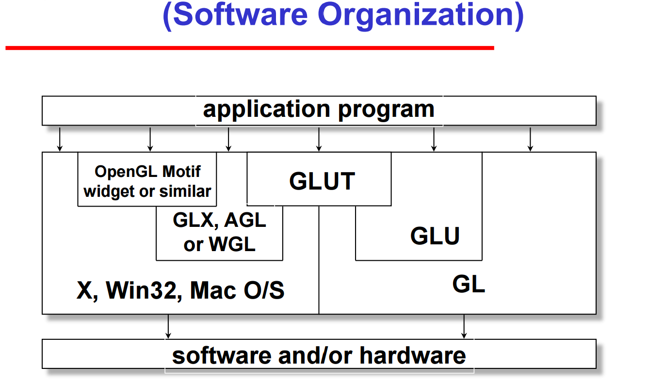 OpenGL的软件架构如下图所示,"Motif"特指 1980 年代的 UNIX 图形标准(现为开源工具包),Widget则指界面控件元素。