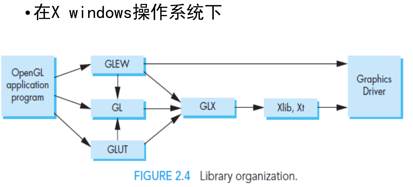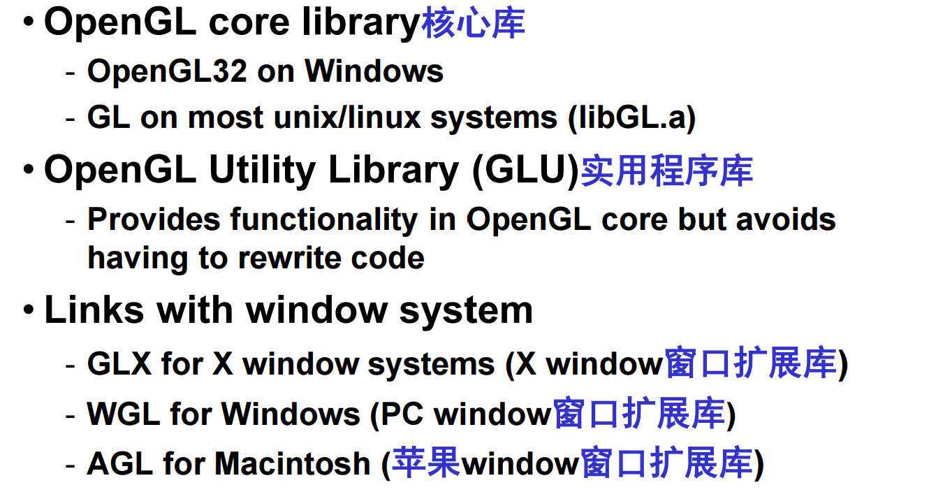 4、OpenGL Libraries介绍如图。其中需要特别说明的是OpenGL Utility Toolkit (GLUT,实用程序工具包),它提供所有窗口系统共有的功能(如Open a window、Get input from mouse and keyboard、Menus、Event-driven),其代码具有可移植性,但GLUT牺牲了针对特定平台的优秀工具包的功能(如slide bars)。