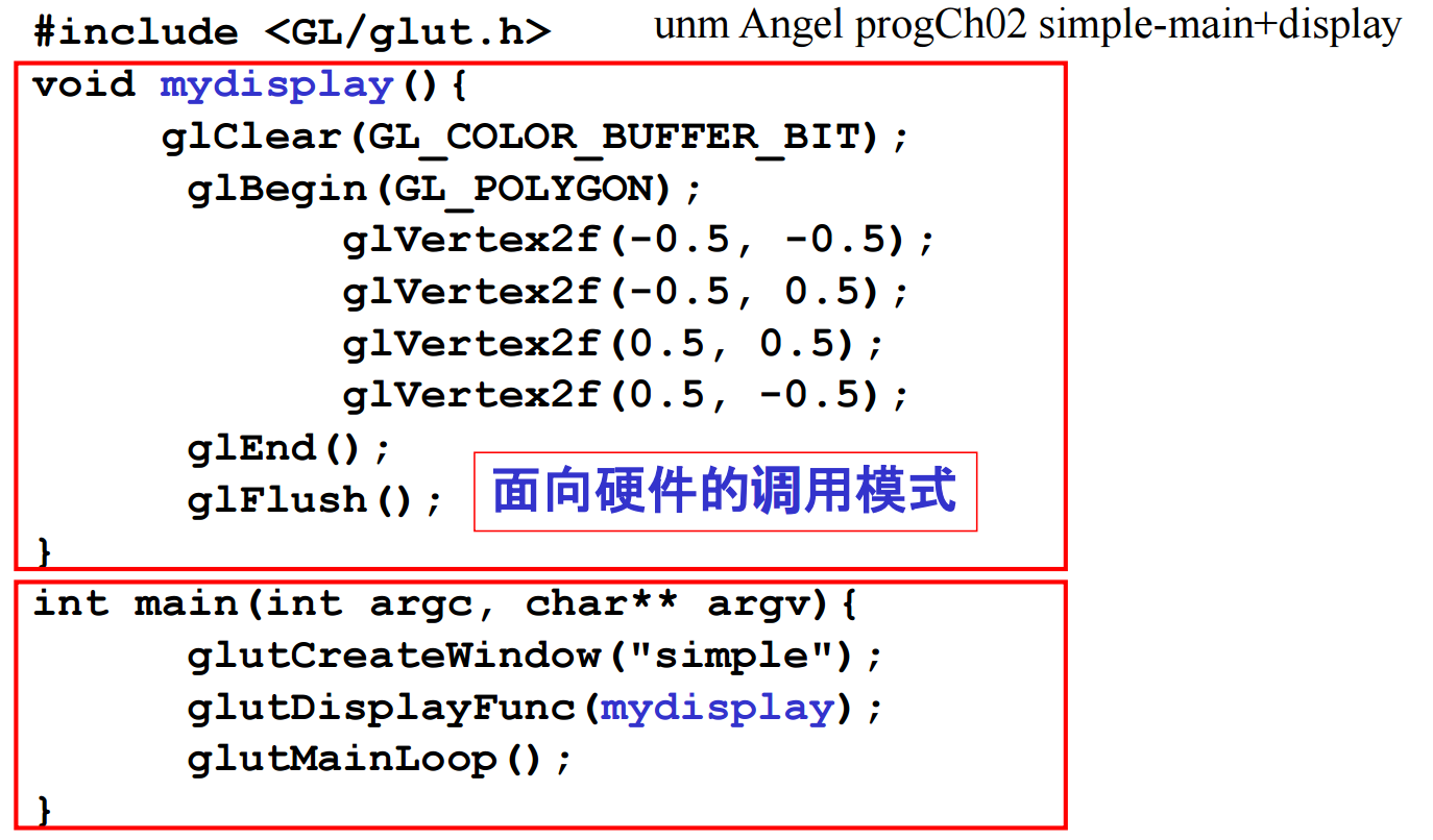 可以看到,该程序定义了一个名为mydisplay的显示回调函数(display callback),每个glut程序都必须有一个显示回调函数,每当OpenGL判断必须刷新显示时,例如当窗口打开时,就会执行显示回调。主函数结束时,程序进入事件消息循环(event loop)。