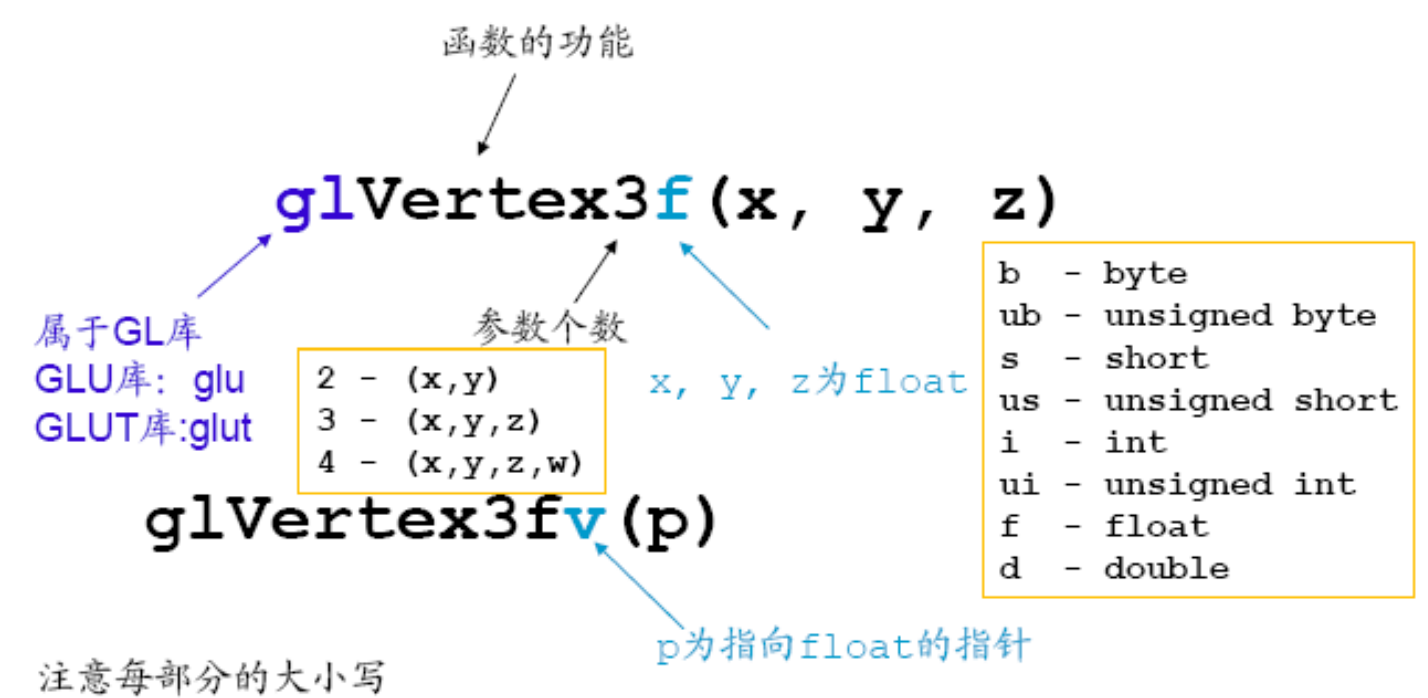 8、需要注意的是,OpenGL不是面向对象的,因此对于给定的逻辑功能,存在多个函数,如glVertex3f、glVertex2i、glVertex3dv。不过它们的底层存储模式是相同的,在C++中创建重载函数也很容易,但问题是效率问题。具体的,函数格式如图所示: