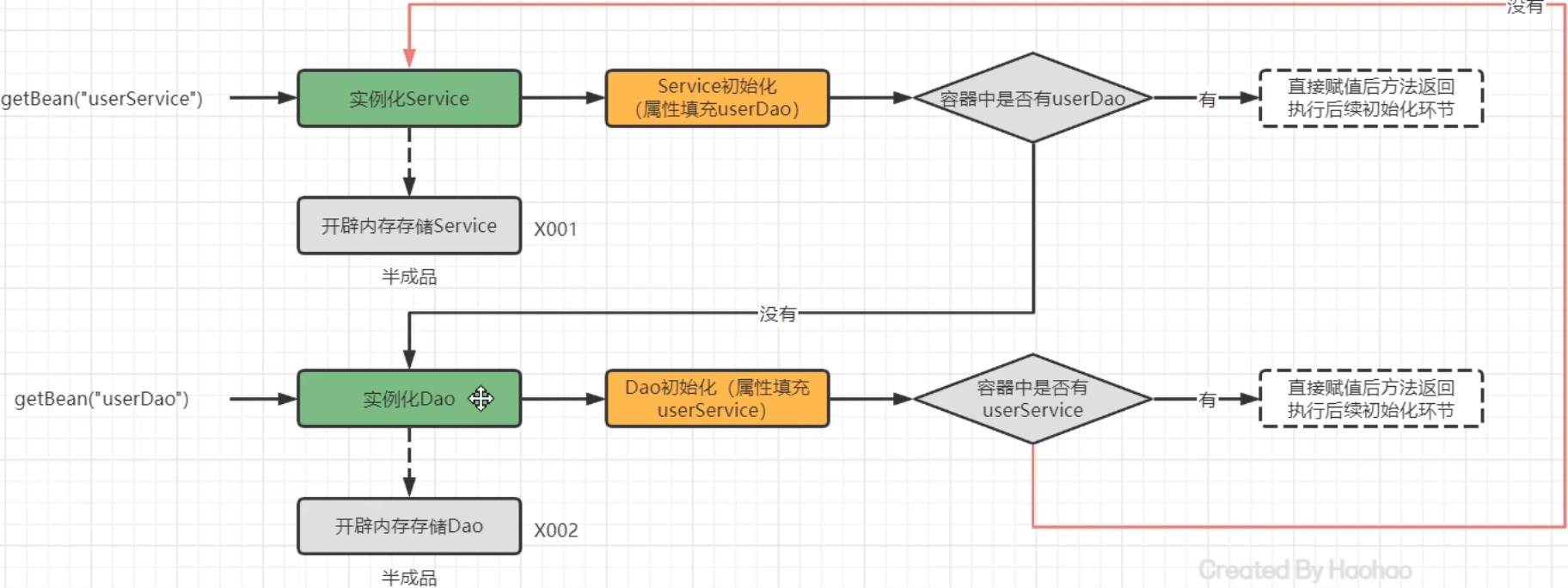 2)UserService属性注入,需要UserDao,从缓存中获取,没有UserDao;