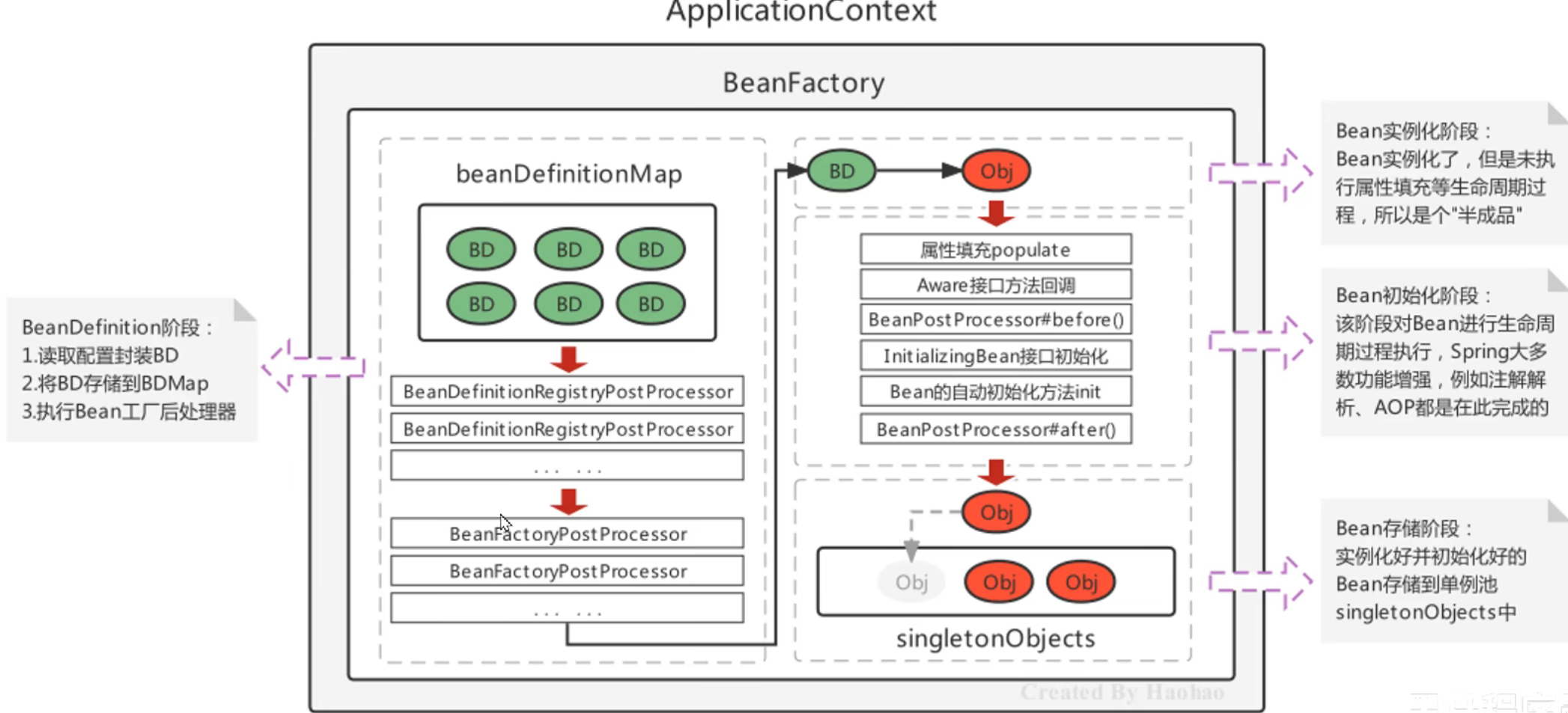 3,Bean的完成阶段:经过初始化阶段,Bean就成为了一个完整的Spring Bean,被存储到单例池singletonObjects中去了,即完成了Spring Bean的整个生命周期。