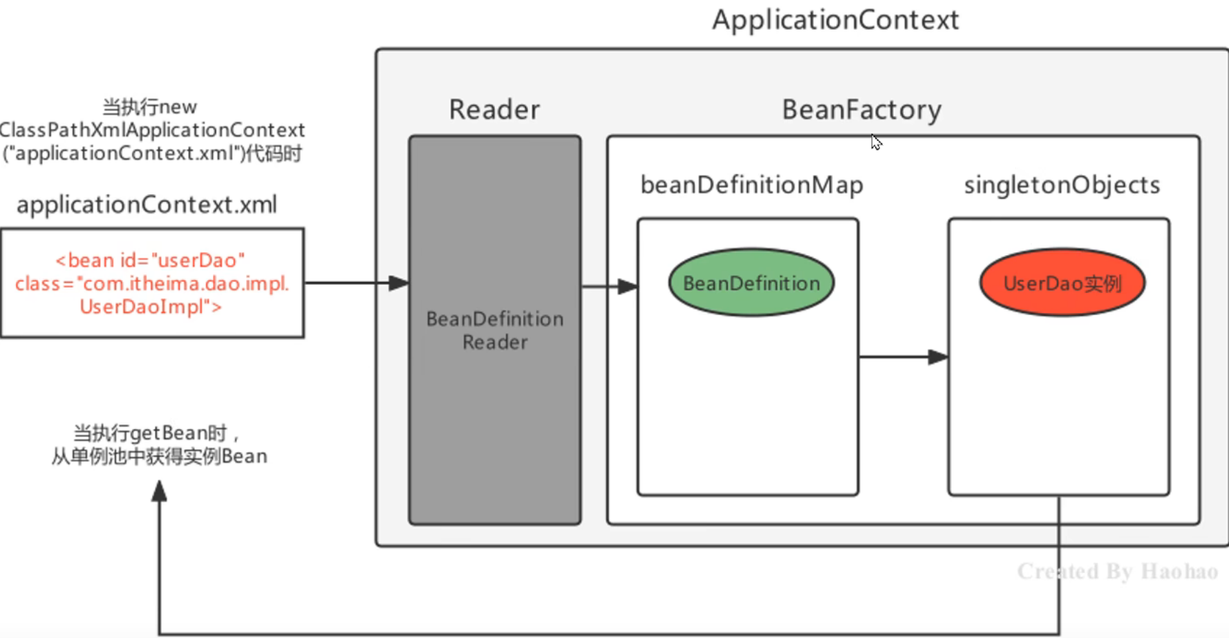 <bean id="userDao" class="com.Dao.Impl.UserDaoImpl"/>此时存储到Spring容器(singleObjects单例池)中的Bean的beanName是userDao,值是UserDaoImpl对象,可以根据beanName获取Bean实例