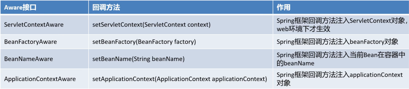 Aware接口是一种框架辅助属性注入的一种思想,其他框架中也可以看到类似的接口。框架具备高度封装性,我们接触到的一般都是业务代码,一个底层功能API不能轻易的获取到,但是这不意味着永远用不到这些对象,如果用到了,就可以使用框架提供的类似Aware的接口,让框架给我们注入该对象。