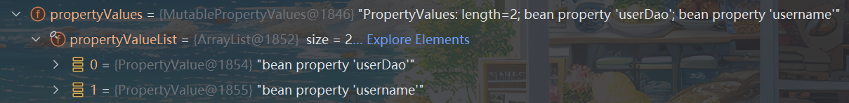 BeanDefinition中有对当前Bean实体的注入信息通过属性propertyValues进行了存储,例如UserService的属性信息如下(beanFactory->beanDefinitionMap->某个beaDefinition对象->value->properValues):