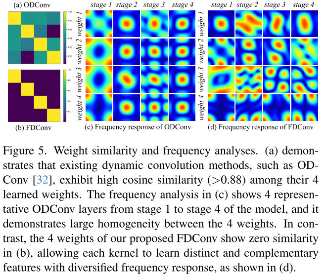 图5(a)显示ODConv的4个权重之间余弦相似度>0.88,而FDConv的权重相似度为0(图5(b)),证明了FDConv成功实现了权重多样性。
