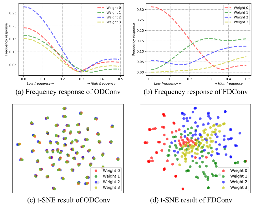 解释:权重频率响应和t-SNE分析。我们将权重的数量设置为4,以与ODConv对齐。(a) ODConv中四个平行权重的频率响应高度相似,表明多样性有限。(b)相比之下,FDConv对每个权重显示不同的频率响应,跨越频谱的不同部分。(c) ODConv的t-SNE图显示,四个权重中的过滤器紧密聚类,表明缺乏多样性。(d) FDConv的t-SNE图显示,四个权重的滤波器分布不同,多样性较大。