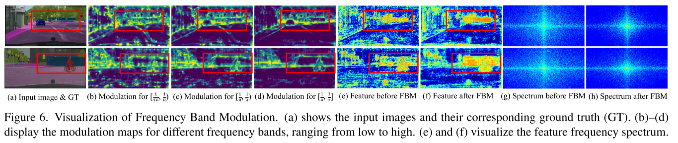 图6显示,FBM的高频段调制值集中在物体边界,而低频段在物体内部有更高的调制值,这种选择性调制使得高频噪声被抑制,前景特征被增强。
