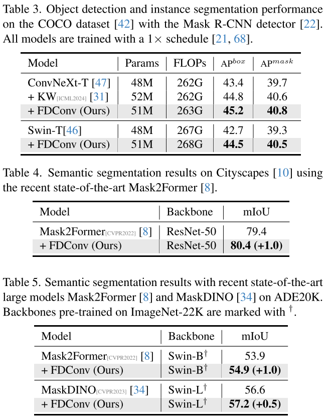 FDConv可无缝集成到ConvNeXt和Swin Transformer中,在ConvNeXt-T上AP^box达到45.2,在Swin-T上达到44.5。