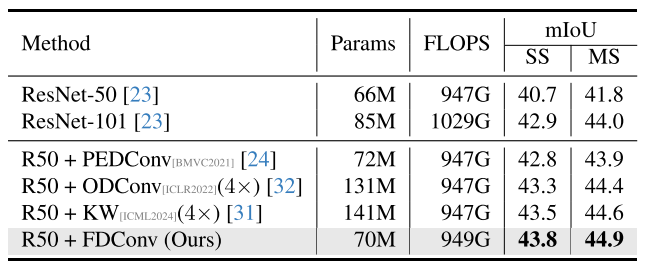 FDConv在参数量仅为70M的情况下,取得了最高的mIoU分数。