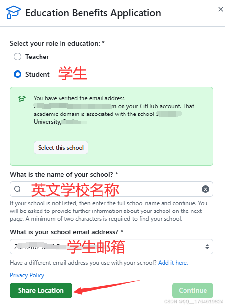 单击开始认证。选择学生,输入学生邮箱和学校名称。然后点击共享位置。