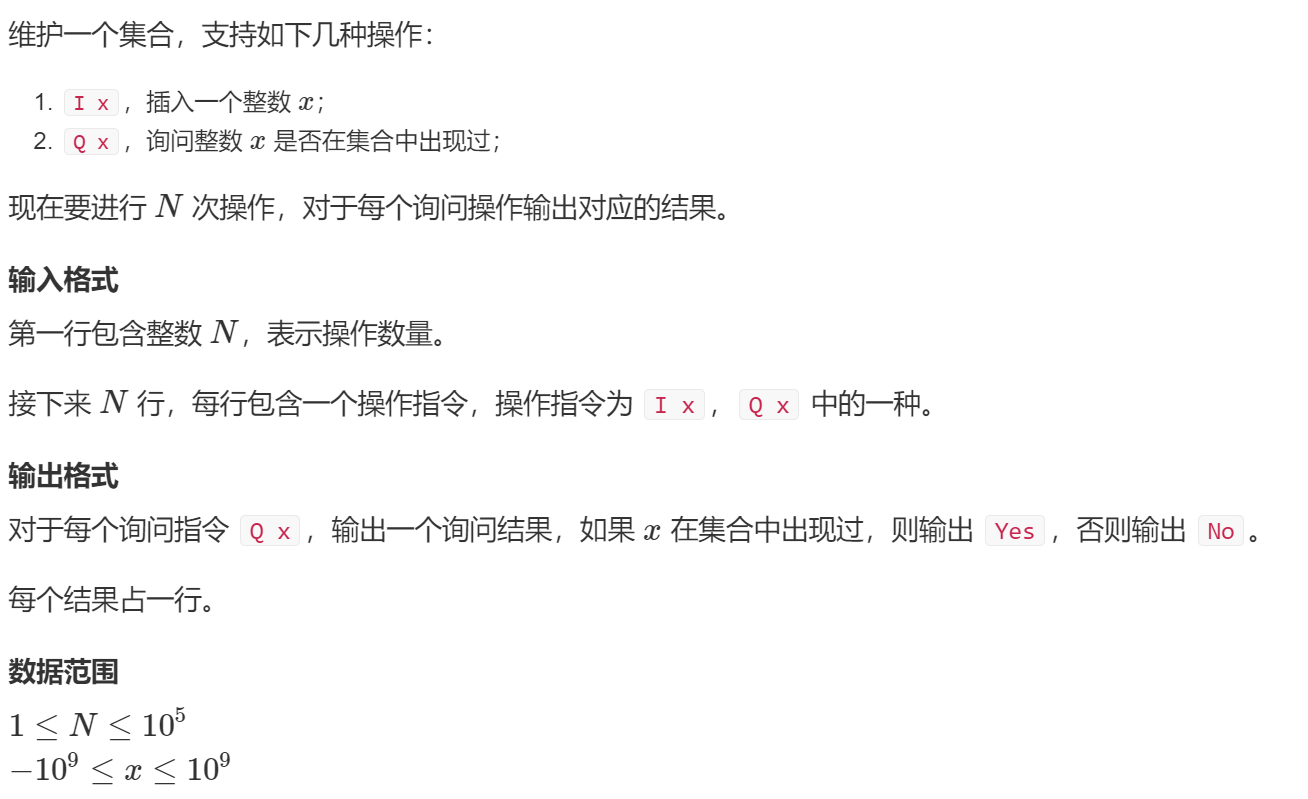{memset(h,-1,sizeof h);//初始化hash表中头结点指向-1int n;cin>>n;while(n--){char op[2];int x;scanf("%s%d",op,&x);if(*op=='I'){insert(x);}else{if(find(x))puts("Yes");else puts("No");}}return 0;