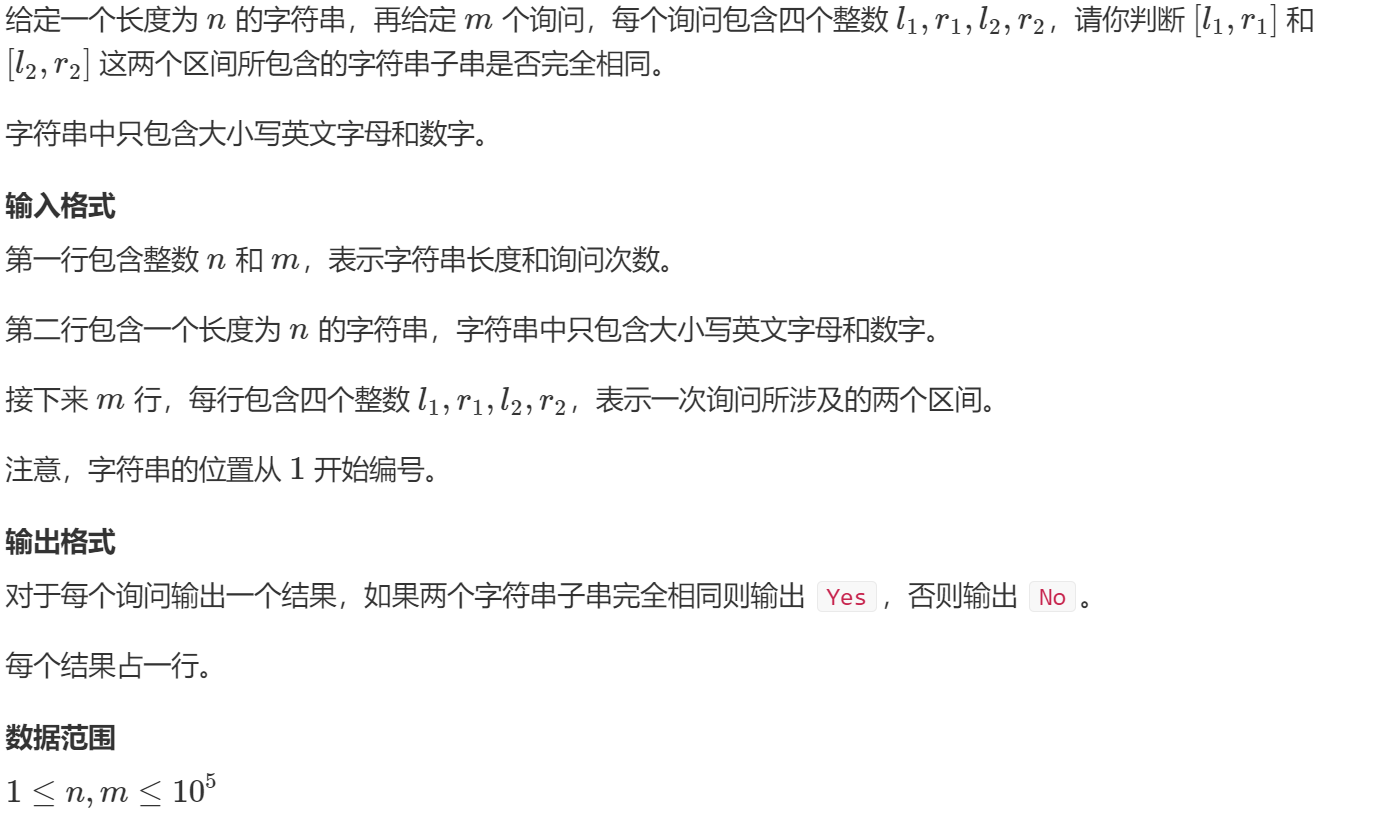 {scanf("%d%d%s",&n,&m,str+1);p[0]=1;for(int i=1;i<=n;i++)//预处理出所有前缀的hash值,{h[i]=h[i-1]*P+str[i];//*P表示这里用了移位(可参考位运算)p[i]=p[i-1]*P;}while(m--){int l1,l2,r1,r2;scanf("%d%d%d%d",&l1,&r1,&l2,&r2);if(get(l1,r1)==get(l2,r2))puts("Yes");else puts("No");}return 0;