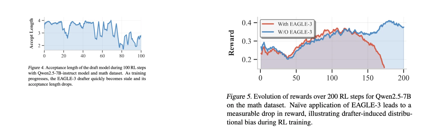 G2:持续actor更新下的drafter陈旧性:随着actor模型在每次策略更新中演进,固定的drafter迅速变得与actor分布不对齐,导致加速效益的损失。如图4所示,在RL训练过程中,EAGLE-3 drafter的接受长度随训练步数增加而急剧下降,从初始的约4个token降至1个token以下。