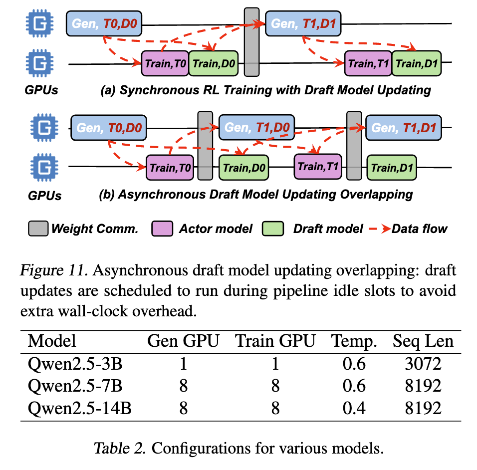 异步更新重叠机制通过利用RL流水线中的空闲时隙,将drafter模型更新与目标rollout并行运行,确保更新产生可忽略的额外wall-clock延迟。这种设计平衡了系统效率和算法新鲜度:避免阻塞同步同时仍提供足够频繁的更新,使drafter模型能够持续跟踪目标的演进分布而不减慢整体训练速度。