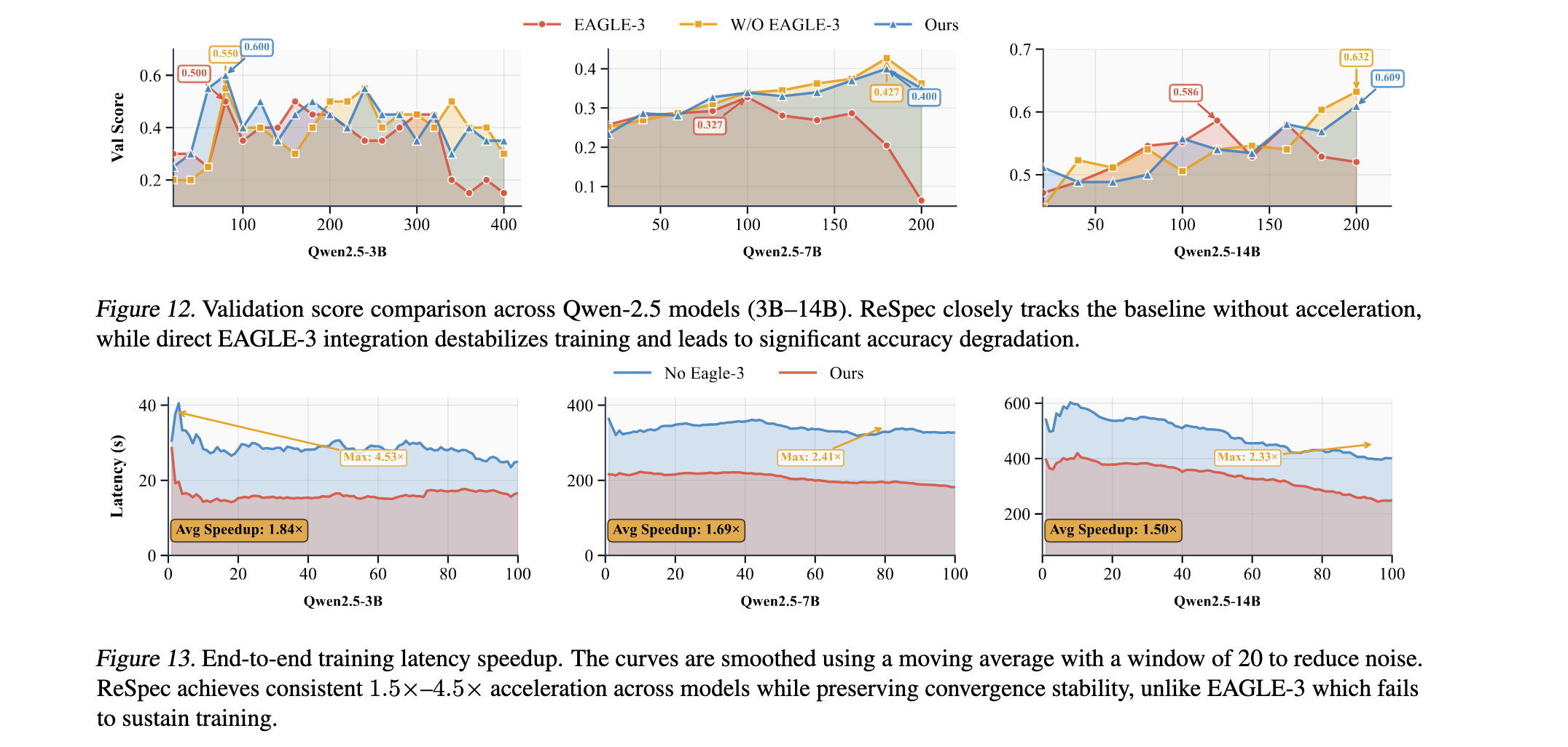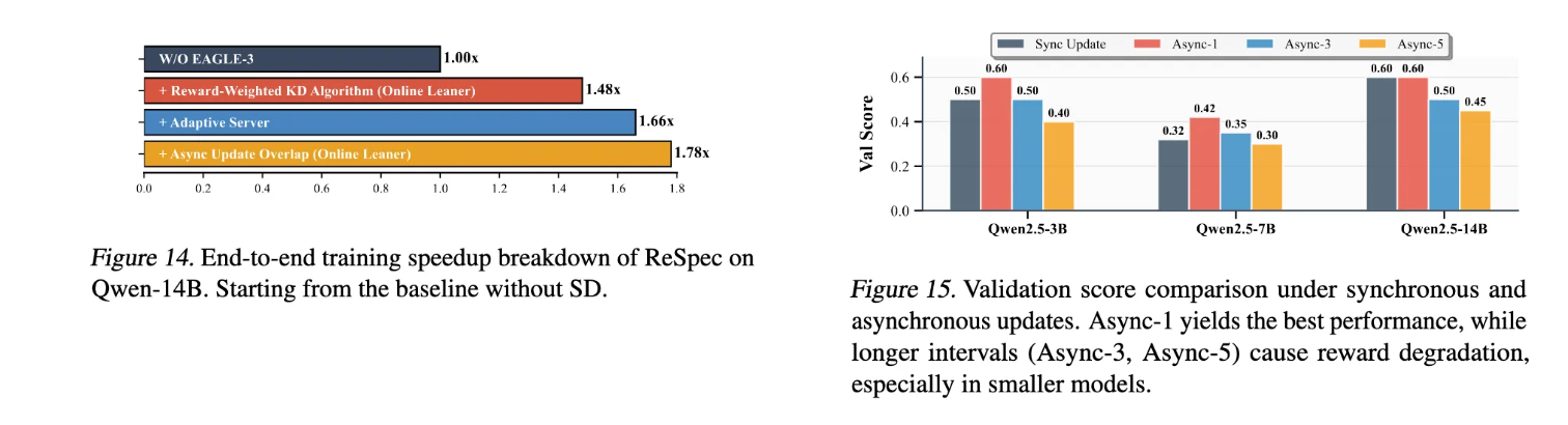 端到端加速效果令人印象深刻。如图13所示,对于Qwen-3B,我们的方法产生高达4.53倍的端到端训练加速,中位数提升约为1.84倍,特别是在推测执行最有效的早期生成阶段。对于更大的模型,增益仍然可观且更加稳定:Qwen-7B平均1.69倍(峰值2.41倍),Qwen-14B为1.50倍(高达2.60倍)。我们观察到推测加速在早期生成阶段最为显著,此时token级并行性得到最大利用。这些发现突显了ReSpec提供了期望的平衡:它在准确性和奖励稳定性方面匹配基线RL训练,同时在不同模型规模上提供一致的端到端加速。