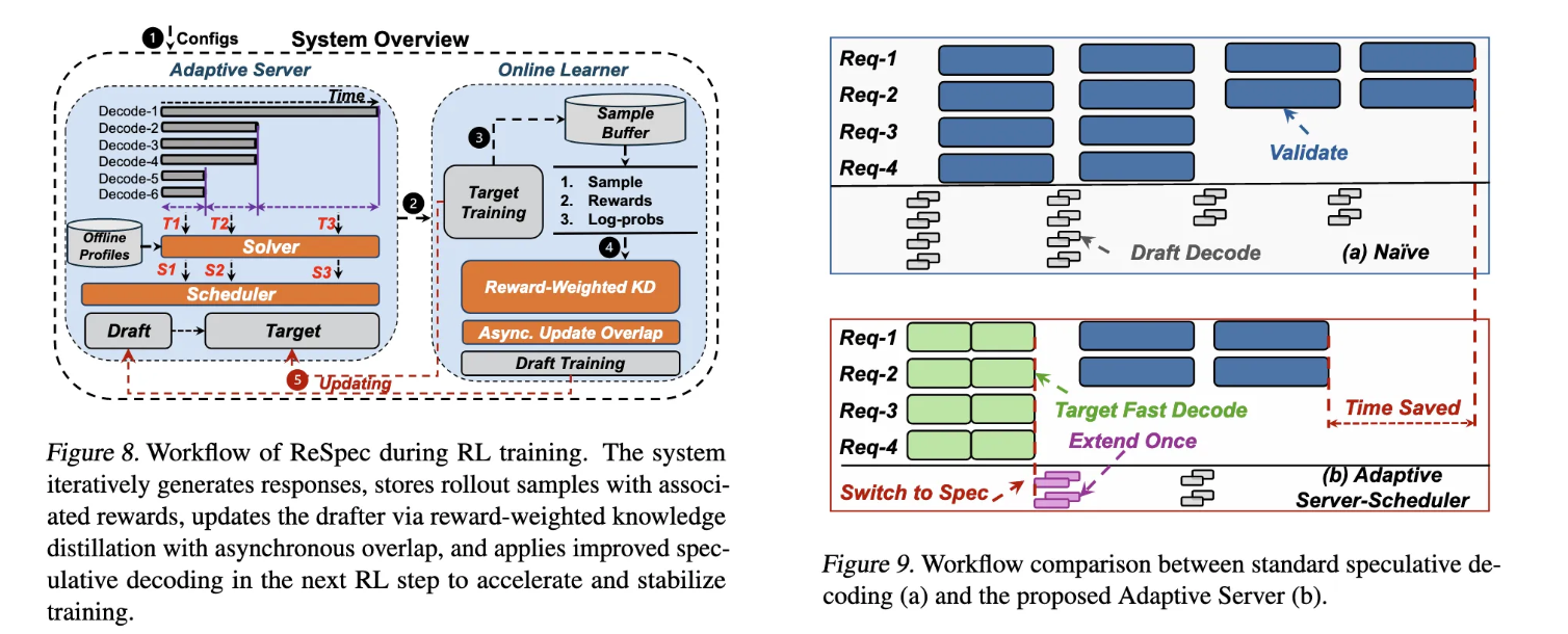 - ReSpec系统设计:设计了首个适应RL训练的SD系统,包含两个紧密耦合的组件:通过分析和运行时调度的自适应SD服务器,以及通过知识蒸馏、奖励加权和异步更新维护drafter对齐的在线学习器