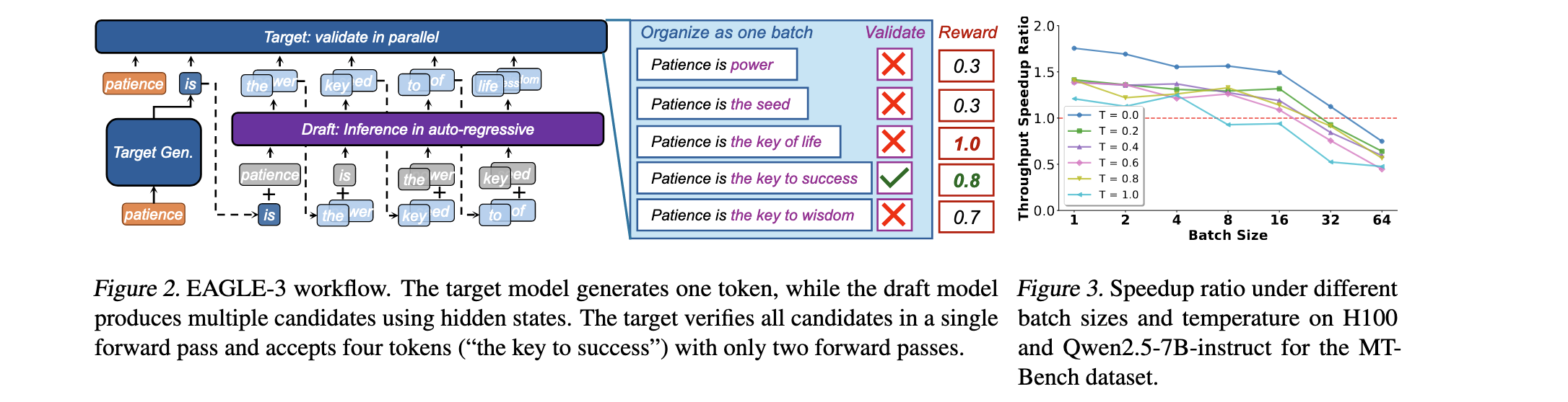 G1:大规模批处理下的加速递减:当生成已经以大批处理大小运行在高GPU利用率时,SD提供的边际并行性变得有限,甚至可能被起草和同步开销抵消。如图3所示,随着批处理大小增加,SD的加速效果显著下降,在某些配置下甚至变为减速(0.76×)。