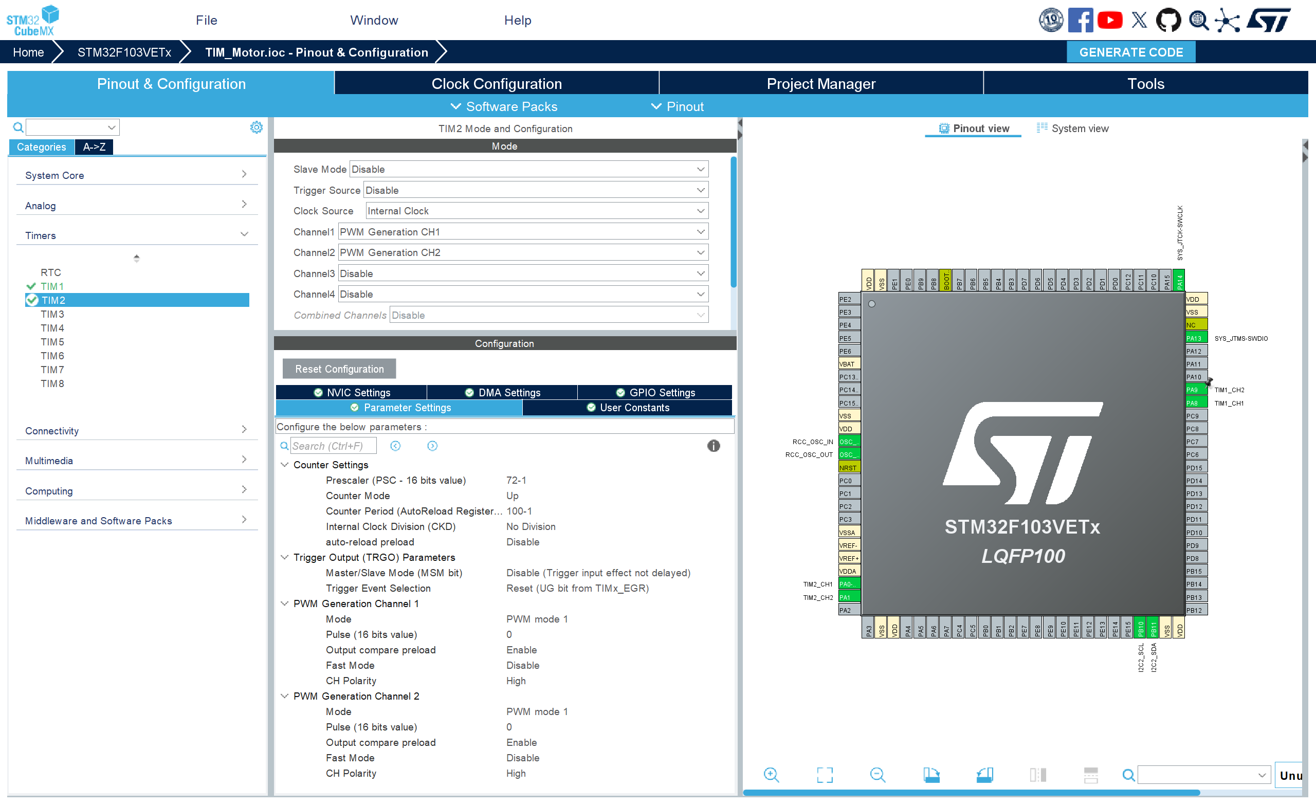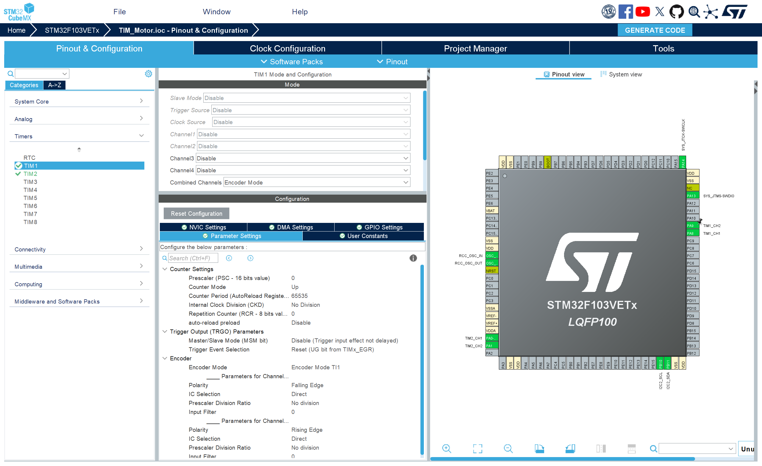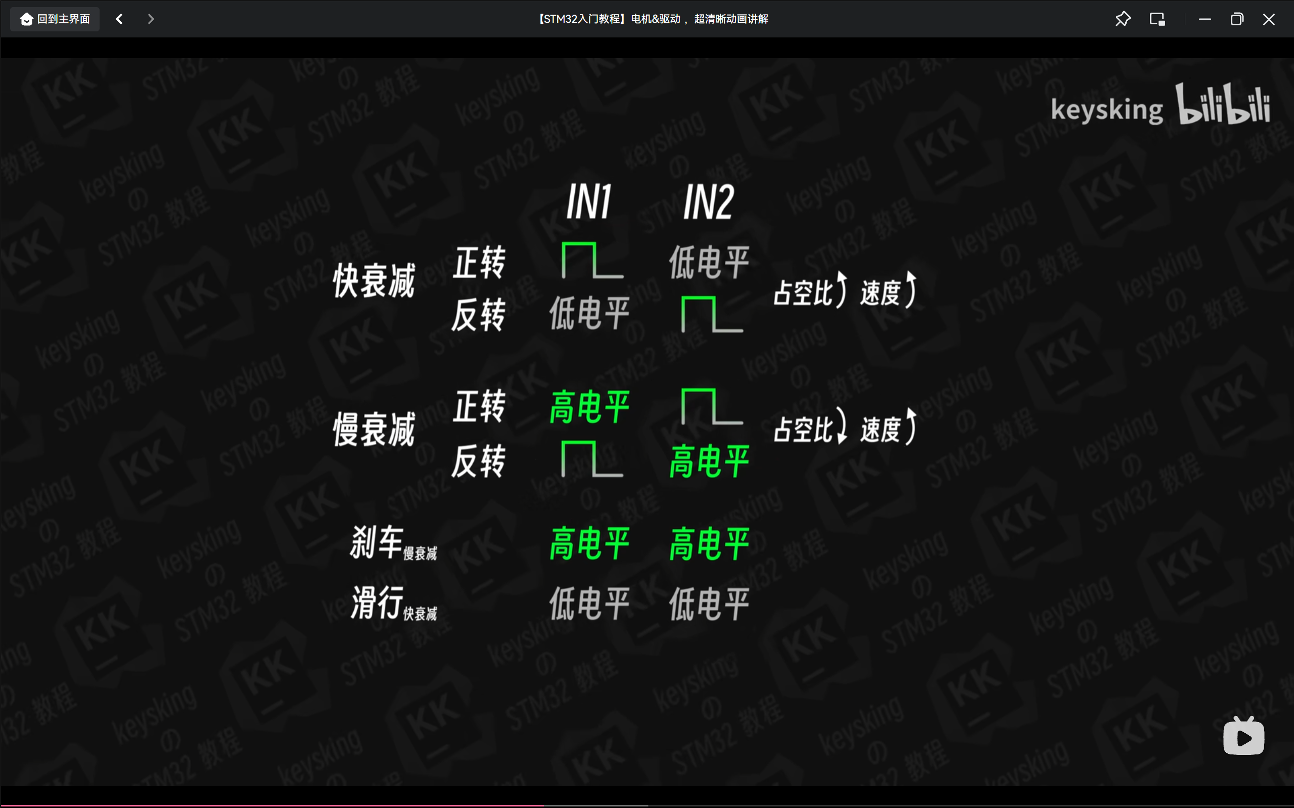 {/* USER CODE BEGIN 1 *//* USER CODE END 1 *//* MCU Configuration--------------------------------------------------------*//* Reset of all peripherals, Initializes the Flash interface and the Systick. */HAL_Init();/* USER CODE BEGIN Init *//* USER CODE END Init *//* Configure the system clock */SystemClock_Config();/* USER CODE BEGIN SysInit *//* USER CODE END SysInit *//* Initialize all configured peripherals */MX_GPIO_Init();MX_I2C2_Init();MX_TIM1_Init();MX_TIM2_Init();/* USER CODE BEGIN 2 */HAL_Delay(20);OLED_Init();DRV8833_Init();HAL_TIM_Encoder_Start(&htim1, TIM_CHANNEL_ALL);__HAL_TIM_SET_COUNTER(&htim1, COUNT_MID);int counter = 0;int speed = 0;char message[50];/* USER CODE END 2 *//* Infinite loop *//* USER CODE BEGIN WHILE */while (1){OLED_NewFrame();counter = __HAL_TIM_GET_COUNTER(&htim1);if (counter > 60000) {counter = 0;__HAL_TIM_SET_COUNTER(&htim1, 0);}else if (counter > COUNT_MID * 2) {counter = COUNT_MID * 2;__HAL_TIM_SET_COUNTER(&htim1, COUNT_MID * 2);}//反转 离20越远速度越快if (counter < COUNT_MID) {speed = (COUNT_MID - counter) * 100 / COUNT_MID;DRV8833_Backward(speed);}else if (counter > COUNT_MID) {speed = (counter - COUNT_MID) * 100 / COUNT_MID;DRV8833_Forward(speed);}sprintf(message, "speed: %d", speed);OLED_PrintASCIIString(0, 0, message, &afont8x6, OLED_COLOR_NORMAL);OLED_ShowFrame();/* USER CODE END WHILE *//* USER CODE BEGIN 3 */}/* USER CODE END 3 */