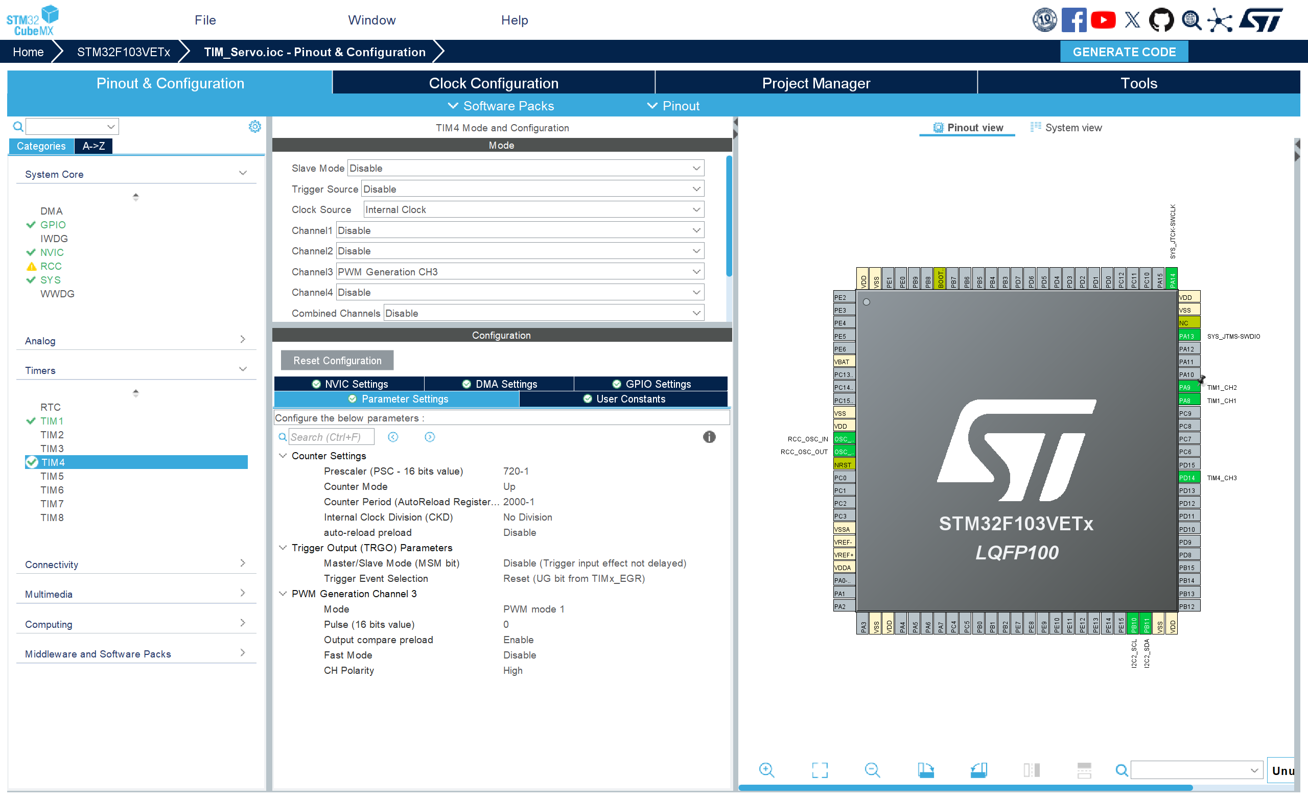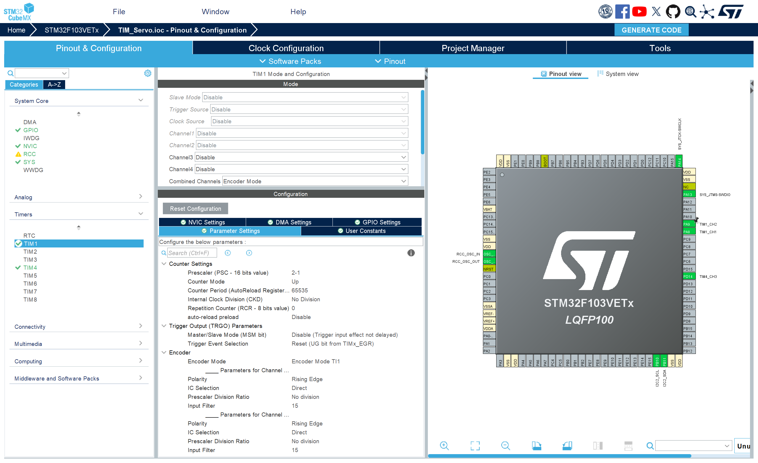 {/* USER CODE BEGIN 1 *//* USER CODE END 1 *//* MCU Configuration--------------------------------------------------------*//* Reset of all peripherals, Initializes the Flash interface and the Systick. */HAL_Init();/* USER CODE BEGIN Init *//* USER CODE END Init *//* Configure the system clock */SystemClock_Config();/* USER CODE BEGIN SysInit *//* USER CODE END SysInit *//* Initialize all configured peripherals */MX_GPIO_Init();MX_TIM1_Init();MX_TIM4_Init();MX_I2C2_Init();/* USER CODE BEGIN 2 */HAL_Delay(20);OLED_Init();HAL_TIM_Encoder_Start(&htim1, TIM_CHANNEL_ALL);HAL_TIM_PWM_Start(&htim4, TIM_CHANNEL_3);int counter = 0;float duty = 0;char message[50];/* USER CODE END 2 *//* Infinite loop *//* USER CODE BEGIN WHILE */while (1){OLED_NewFrame();counter = __HAL_TIM_GET_COUNTER(&htim1);if (counter > 60000) {counter = 0;__HAL_TIM_SET_COUNTER(&htim1, 0);}else if (counter > COUNT_MAX) {counter = COUNT_MAX;__HAL_TIM_SET_COUNTER(&htim1, COUNT_MAX);}duty = (10 * counter / (float)COUNT_MAX + 2.5) / 100.0 * 2000;__HAL_TIM_SET_COMPARE(&htim4, TIM_CHANNEL_3, duty);sprintf(message, "duty: %.2f", duty);OLED_PrintASCIIString(0, 0, message, &afont8x6, OLED_COLOR_NORMAL);OLED_ShowFrame();/* USER CODE END WHILE *//* USER CODE BEGIN 3 */}/* USER CODE END 3 */