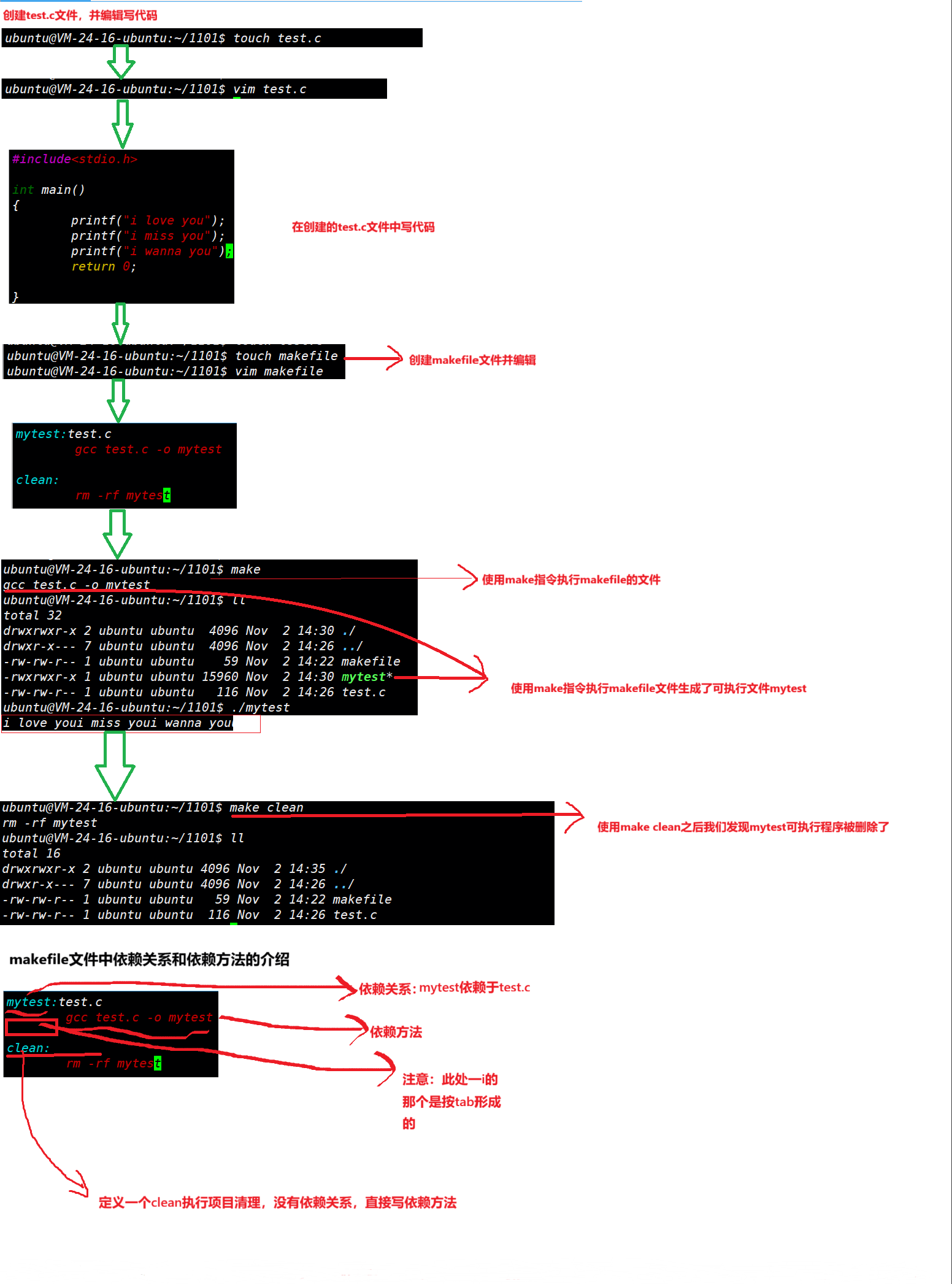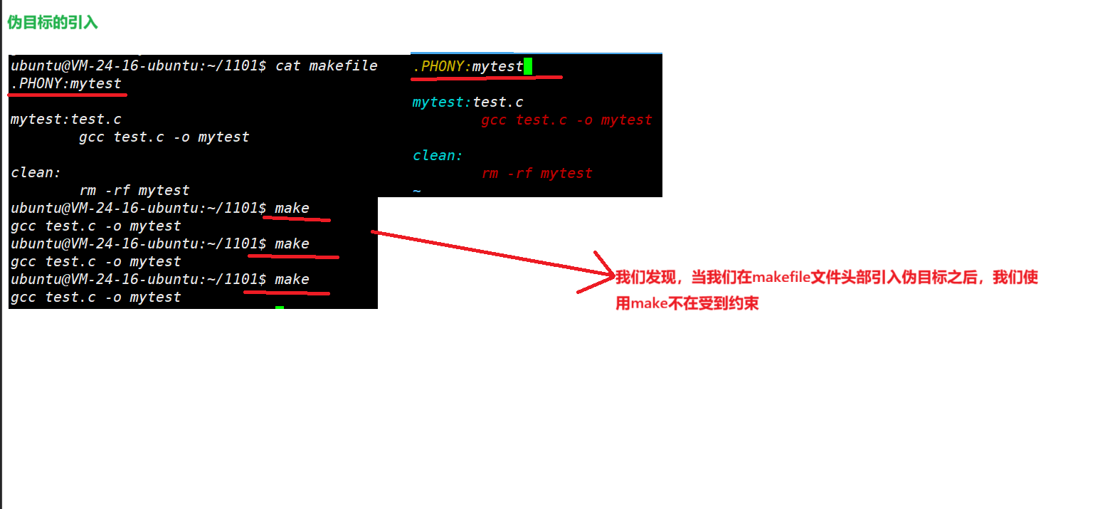 注意:为了让我们每次执行的后形成的可执行文件是最新的,所以我们要在clean前面带上伪目标.PHONY