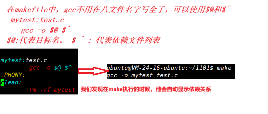 在makefile中,gcc不用在八文件名字写全了,可以使用$@和$^