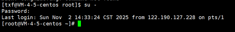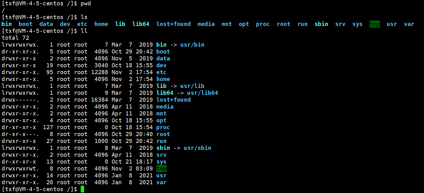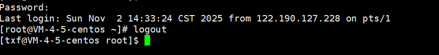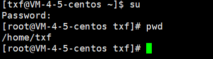 但是依旧还是/home/txf路径下,只是做了身份的切换,如果,一开始在登入的时候就登的是root用户,那么就会在root路径下