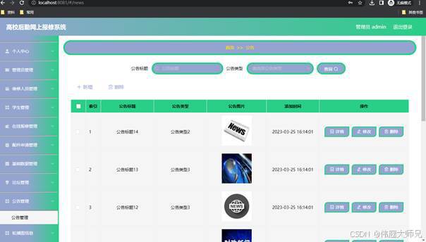 如图5.4显示的就是公告信息管理页面,此页面提供给管理员的功能有:根据公告信息进行新增、修改、查询操作等等。